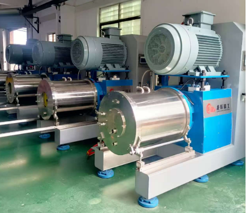 砂磨机的工作原理是利用泵将预先在浆料桶内经高速搅拌混合的浆料输入密闭的研磨腔体内,与高速转动的研磨介质接触,从而使物料中的固体微粒和研磨介质相互间产生更加强烈的碰撞、摩擦和剪切作用,达到加快磨细微粒和分散聚集体的目的。从研磨腔体内流出的浆料回到浆料桶,再次重复前述分散过程。经过多次循环,达到要求的细度和很窄的粒度分布范围。